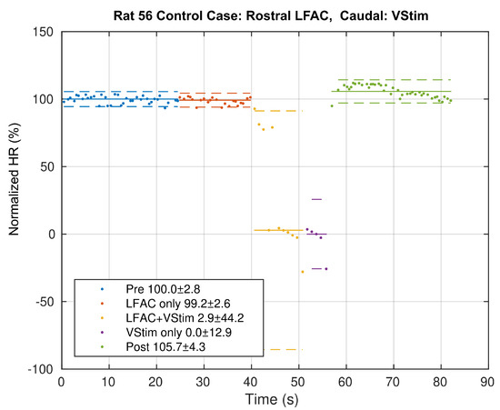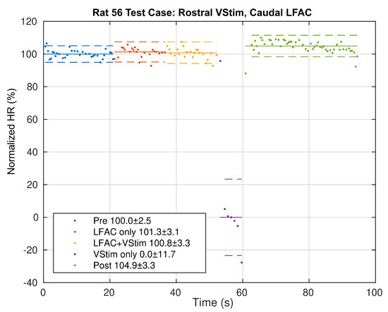 The percent block was estimated using Equation (1), the normalized HR, but applying the value of the local minima of the RR rate as the marker. This is shown in Figure 4. The median of each epoch is then used to derive an estimate of the percent block and its variance for each epoch. The percent block represents the prevention of disruption to the heart rhythm. The absence of a RR rate depression during LFACb+VStim suggests that LFACb blocked the effects of vagal stimulation projecting to the heart. In this particular example, LFACb achieved a block of the effects of vagal stimulation.