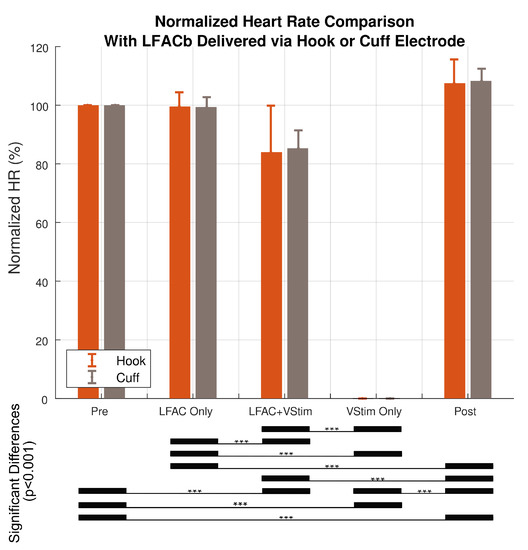 One-way ANOVAs were performed to determine differences in the normalized heart rate versus conditioning epoch for the hook and cuff electrode data. The results indicated that there was a statistical difference within the five epochs of the test sequence (F(4,125) = 755.6, Pr (>F) = and F(4,70) = 2271, Pr (>F) = , respectively). Tukey post hoc results showed that there was no significant difference between ‘Pre’ and ‘LFACb only’ in both the hook and the cuff (p-adjusted = 0.99, p-adjusted = 0.77, respectively) data sets. A subsequent Two-way ANOVA was performed to determine whether there was a difference between the results obtained using a hook or cuff electrode. This combined result represented in Figure 6 supported the hypothesis that there was no significant difference between cuff and hook ((F(1,195) = 0.046, Pr(>F) = 0.830)). Additionally, Tukey post hoc results indicated that there was no statistical significant difference between ‘Pre’ and ‘LFACb Only’ (p-adjusted = 0.98). This further demonstrates that there is no onset response associated with LFACb.