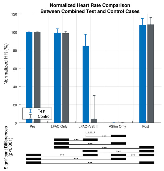 Summary of the normalized heart rate versus treatment for the Test (N = 41) and Control (N = 23) cases. The two-way ANOVA revealed a significant difference due to experimental case (F(1,310) = 229.6, Pr(>F) = ), a significant difference due to treatment (F(4,310) = 1607.5, Pr (>F) = ), and a significant difference between experimental case and treatment (F(4,310) = 229.8, Pr(>F) = ). There were no significant differences in the ‘Pre’ vs. ‘LFACb Only’ epoch between and within the control and test cases (Tukey post hoc). However, there was a significant difference in the ‘LFACb+VStim’ epoch between the control and test (p-adjusted = 0). The error bars indicate standard deviations. *** Indicates significant differences ().