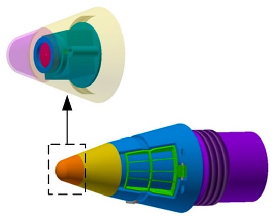 As shown in Figure 1, the organization is composed of three parts. The aft part, shown in purple, connects the fuze and the projectile with threads. The mid part, indicated by blue, is used to externally fix the rudder blade and internally contain the sensors for control. When the mortar rotates, the fuze can rotate in the opposite direction to the projectile to ensure a stable field of view for the image sensor. The front part, equipped with the infrared image sensor, is used for navigation. In addition, the detail of the infrared image sensor is shown at the top of Figure 1, where the fairing is at the top. The green base is used to fix the sensor and lens. Therefore, the infrared image sensor is not affected by the rotation of the projectile due to the reverse function of this structure. Correspondingly, this design makes the field of view stable and ensures the detection capability.