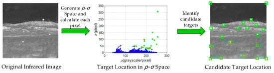 The discussion in Section 2 shows that the algorithm should have three features, namely adaptive infrared small target detection capability, scales’ changeable adaptability and low running time. In an infrared scene, most small targets exist in relatively open areas and have higher grayscale than their surroundings. Correspondingly, infrared small targets should have two features, maximum grayscale in the local region and farther distance from any higher gray value pixel. Figure 2 shows the flowchart of the density-distance space for the infrared small target detection method. First, the two main parameters density-ρ and distance-σ are generated from the original infrared image. Then, the ρ and σ values of all pixels are converted into a special two-dimensional ρ-σ space. The green candidate targets are selected from this space through an adaptive threshold, including real multiple targets and false targets.