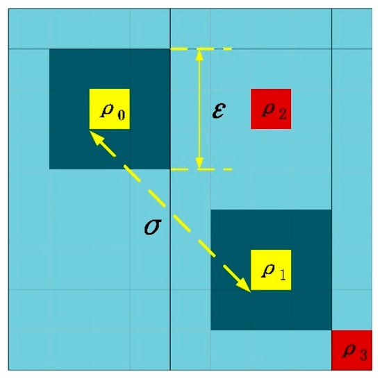 The parameter σ is defined as the distance feature of the pixel, which means the minimum distance between pixel i and any other pixel j with higher density. Equations (5) and (6) show the calculation of distance, where dij represents the Euclidean distance between pixel-i and pixel-j, and x and y are the coordinate values of the pixels. Figure 3 shows the calculation process of density and distance. The area with light blue is the original image, and the deep blue is ε, which has a 3 × 3 size. The order of density is ρ2 < ρ0 < ρ1, ρ3. For pixel-ρ0, σ is the distance between ρ0 and ρ1, which is shown in yellow. Although ρ2 has a shorter distance, its density is less than ρ0. Correspondingly, the density of ρ3 is higher than ρ0, but the distance is longer than ρ1. Therefore, the two red pixels could not be selected as the correct distance value. It should be noted that when the pixel-i has the maximum density, there is no σ. We temporarily take its σ to the maximum value among all dij values, because it may be the true target and cannot be ignored. Then, it will be compared with other pixels through the subsequent adaptive threshold.
