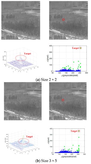 Figure 4 shows the establishment and preliminary detection of ρ-σ space of two targets with different sizes at the same position. The sizes of the two targets in Figure 4a and b are 2 × 2 and 3 × 5, respectively. We extracted a region with 25 × 25 pixels containing the target. As shown, even if the target sizes are different in the original image, the targets with the same position have similar positions in the ρ-σ space, approximately. This test shows that the ρ-σ space has the ability to detect multi-scale targets.