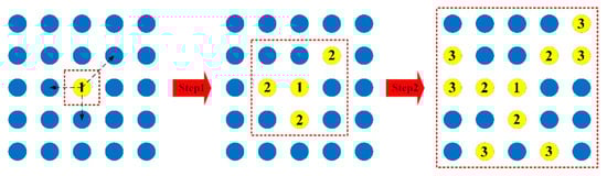 Figure 5 shows the process of APG, where seed, Tk, is shown in yellow, and the surrounding pixels, Pk, are shown in blue. The red dotted frame indicates the range after each step of APG. At the beginning, there are three pixels around the seed, T1(x,y), within the growth threshold, Th, which are P1(x + 1,y + 1), P1(x,y − 1) and P1(x − 1,y), respectively. After the first step, three new seeds marked with number 2 are added. Similarly, after the second step, the new seeds are marked with number 3. For this seed, the area S1 contains 10 pixels after two steps of APG.