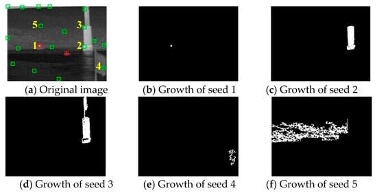 Growth features of seeds: (a) contains 5 seeds in different regions, (b) is the seed of the target region and (c–f) are the seeds in clutter regions.