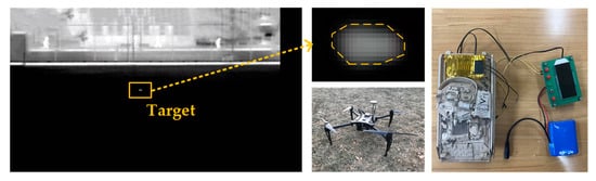 The prerequisite for the algorithm verification was that the infrared imager could clearly observe infrared small targets. For this purpose, both equivalent size and temperature difference should be considered. We used FLIR’s Tau2 infrared imager with the same parameters as in Table 1 for experiments. A vehicle model connecting with an electrically conductive board was used to replace the infrared target. A temperature sensor powered by a battery was connected with the electrically conductive board through its own thermometer. When the surrounding environment temperature, T0, is known, the temperature sensor could control the temperature, T1, of the electrically conductive board to maintain the temperature difference (T1 − T0). The infrared image sensor was carried by an UAV to achieve the long-distance detection. The experimental conditions are shown in Table 2.