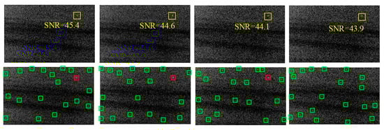 The detection result is easily affected by noise. Therefore, the anti-noise ability should be tested. In order to reflect the effect intuitively, an image with one infrared target was selected, and different levels of Gaussian noise were added in this picture, respectively. SNR is defined as in Equation (10), where is the grayscale variance of the target region and is the variance of Gaussian noise. Figure 8 shows the noise with different SNR and target detection results. Obviously, the target is hard to detect as the SNR decreases gradually. When SNR was from 44.1 to 45.4, we obtained a perfect detection result. The target missed when SNR was reduced to 43.9. The changes of position of the remaining candidate targets are caused by the randomness of Gaussian noise. Consequently, the lower limit of SNR that the algorithm could detect the target at is around 44. When SNR was higher than 44, the algorithm could detect the real target. Otherwise, depending on the distribution of noise, it may not detect the real target. The test clearly showed a certain degree of anti-noise ability of the algorithm based on density-distance space and the APG method.