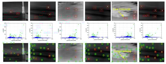 In Figure 9, the red rectangles represent the real targets, and the green ones represent the candidate targets. In the first four images, all real targets were well-detected under the interference of various clutters. No false detections or missed detections occurred. Two extreme conditions should be considered. In the fifth image, only three of the four real targets were detected because the missing target has a minuscule grayscale. In the sixth image, all targets were detected by setting n to 6 individually. The results proved that our method had a superior robustness, adaptability and efficiency for the detection of multiple infrared targets in most conditions. However, the target with a low α value will still be missed when its thermal signature is lower than clutters.
