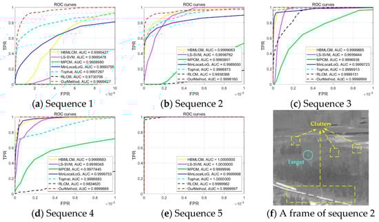 Figure 10 shows the ROC curves and AUC value. The red dotted line represents the proposed algorithm. It can be seen from all ROC curves that the proposed algorithm generally has a superior detection accuracy. In sequences 3–5, the AUC value of our algorithm is almost close to 1. However, the detection accuracy of sequence 2 is not ideal. This is due to more clutter and the low target grayscale. For example, the second sequence shown in Figure 10f has many clutters with a small area, which seriously interfere with the step of pixel growth. The AUC value of our method was 6.02 × 10−5 and 9.03 × 10−5 lower than that of HBMLCM and LS-SVM. Thus, the detection rate of our method is slightly worse than that of LS-SVM and HBMLCM but better than the other four algorithms.
