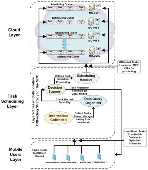Figure 2 and Figure 3 depict the working of the task scheduling layer. All three layers are processed according to their assigned tasks. Initially, the information collection module of Layer 2 receives the mobile devices’ data for strategic decision-making. When the task is not sufficient for the local mobile device computation, the data query organizer organizes and supports this device to process these steps. The task passed from the data query organizer is now well established and ready to decide the task offloading towards the cloud layer. The scheduling handler manages and finalizes the offload to the mobile cloud layer. The complete strategy is a layer-based collaborative offloading strategy to offload the tasks to the mobile cloud layer.