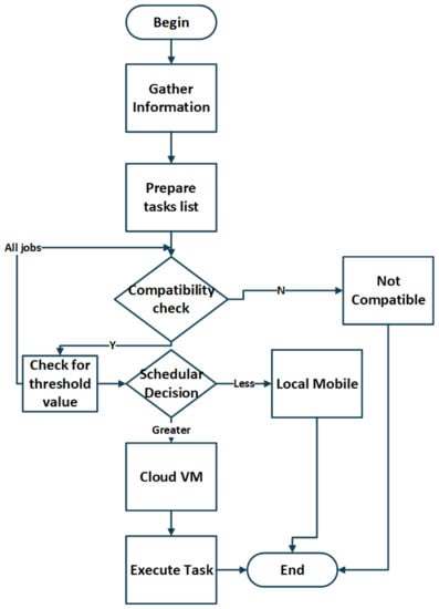 The task scheduling process based on Algorithm 1 (below), which estimates the job, needs to be executed on mobile and the job performed on the cloud VM. Initially, the algorithm gathers the mobile device information through mob_info(T, B, L, S, App), the number of jobs through jobs_num(m), the number of mobile nodes with nodes_num(n), and gets the mobile information with fetch_info(T). Based on the information gained through steps 1, 2, 3, and 4, new mobile cloud nodes, a job schedular, and cloud VMs are created. The mobile device sends the information to the schedular with arguments. If the execution time is less than the justified threshold value, then the task should be processed on the mobile cloud, and if the task is heavyweight, then the task is uploaded towards the cloud VM. The equation below in step 7 of the cloud estimation plan based on this approach allows the system to continuously check the job execution time computed through Equations (1)–(3). The system then schedules the task for either the cloud VM or local mobile devices. Finally, the algorithm returns the job state.