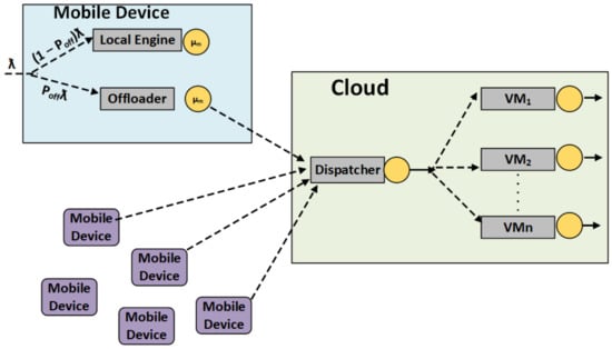 Our proposed model constructs two separate networks: task handling and VM networking to process task distribution and task handling. There are two basic networking models, one for mobile devices. The mobile device can process basic applications and enhance the capabilities for classifying the network system, consisting of a mobile device local engine and mobile device off-loader for offloading the tasks/jobs to the cloud for the relevant processing. The equation that describes the local engine to solve the task is (1 − Poff)λ. The task offloading capability of the mobile devices is checked based on the job’s time for every task. The time calculation probability on the mobile device is calculated with Equation (1). The model represents the local mobile calculation and task submission towards the mobile cloud. (1 − Poff)λ represents the time subtracted from the total mobile calculated time.