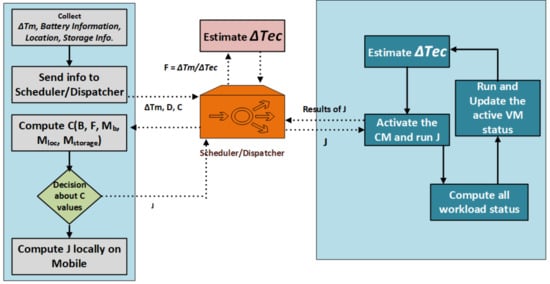 In Equation (1), ΔTtotal mobile calculates the total time of the local mobile for calculation and submission for processing. In this equation, the λ represents the system’s job request rate that required the mobile to get jobs/tasks from the devices. The ΔTtotal mobile total time indicates the total time for calculations on mobile devices. Similarly, if it requires a job to be scheduled on the cloud for the dispatcher/scheduler, its time is calculated using