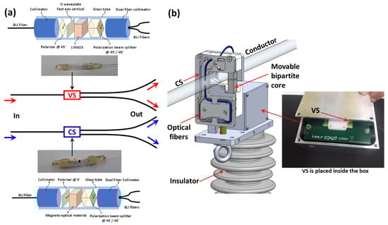 (a) Optical setup of the voltage (VS) and current (CS) optical sensors; (b) sensor head showing details of the placement of the VS and CS in the packaging.