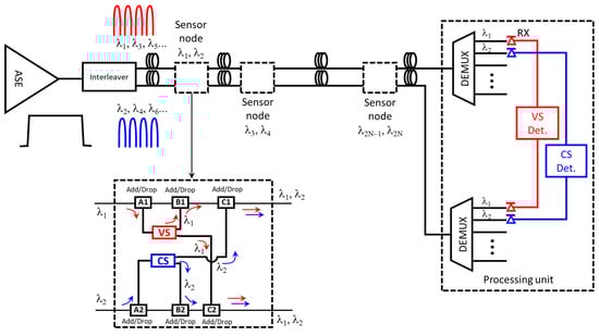 To better understand the sensor node, we refer to the inset of Figure 2. λ1 from the odd wavelength in the upper fiber of the figure is drooped by the A1 add/drop and is directed to the VS sensor. The first output of the VS is sent to the B1 add/drop that re-adds this wavelength to the fiber. This signal passes unperturbed (unless an insertion loss happens) through the C1 add/drop. The second output of the VS sensor is sent to the C2 add/drop in the lower branch of the node and re-added to the second fiber. Similarly, the λ2 at the lower fiber optics of the inset is dropped and redirected to the CS by the A2 add/drop; the first CS output is directed to the upper fiber and added by the C1 add/drop. The second output of the CS is added again to the lower fiber by the B2 add/drop. This signal passes unperturbed (unless an insertion loss happens) in the C2 add/drop and travels through the lower fiber to the other nodes. The pair after this node, λ1 and λ2, will not be affected by subsequent nodes because they add and drop other wavelengths.