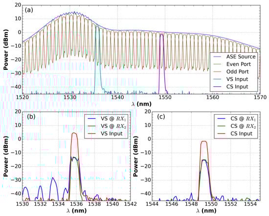 (a) Signal spectrum of the ASE light source at the interleaver input, the “Even” and “Odd” ports of the interleaver device, and the signals from the current and voltage sensor inputs, separated by Add/Drop. In addition, (b) the spectrum of the input of the voltage sensor (VS) and signals of the VS @ RX after passing through DEMUX; (c) the spectrum of the input of the current sensor (CS) and signals of the CS @ RX after passing through DEMUX.