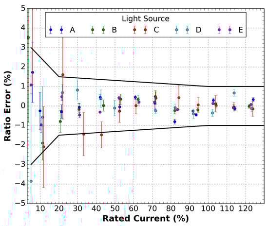 Ratio error curve as a function of the rated current for various evaluated light sources.