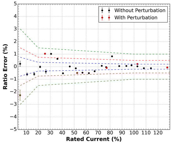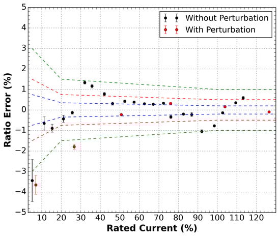 Ratio error measurements as a function of the rated current for the sensor outside the DWDM network. Two conditions were measured, with and without disturbance in the optical cable of the sensor. Green dashed lines are the 1.0 class limits, red dashed lines are the 0.5 class limits, and the blue dashed lines are the 0.2 class limits.