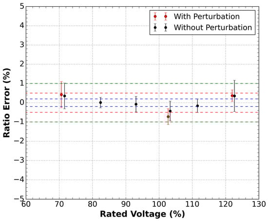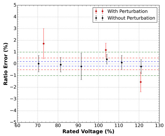 The procedure to obtain the error for each applied voltage was the same as the current sensor described in the previous section. Figure 8 shows the results of the measurements. It is possible to notice that the sensor is classified as class 0.5%. However, in the presence of disturbance, this response undergoes a considerable change, leaving class 1%. This result can be explained due to the lower signal-to-noise ratio (SNR) of the voltage sensor compared to the current sensor.