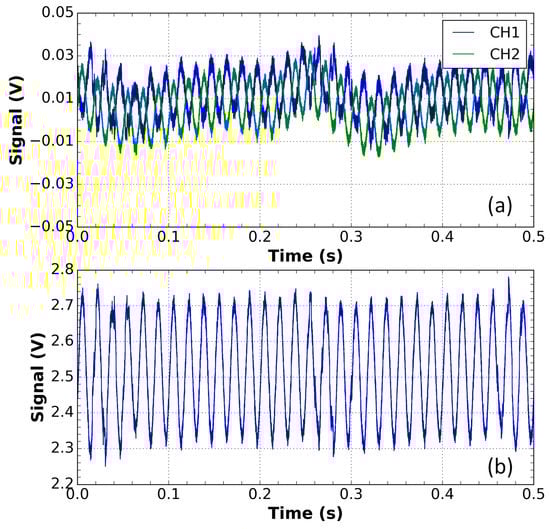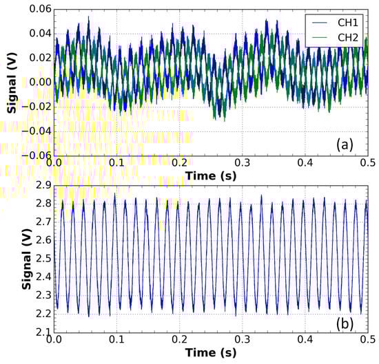 Measurements for the sensor outside the DWDM network. (a) Waveforms of the CH1 and CH2 channels of the voltage sensor output in the presence of a disturbance with an applied voltage of 9.56 kV. These signals were subtracted to compensate for the amplitude variation; (b) the result of this subtraction.