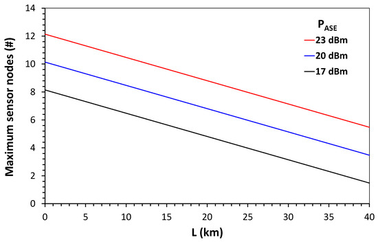 To compute the maximum node quantity in the network, we chose the parameters of (2) using data from commercial devices. The launch power of the source was 23 dBm, with BASE = 30 nm. The loss of spectrum slicing, performed by the interleaver was 17.78 dB for a 30 nm device, with Bch = 0.8 nm (100) GHz bandwidth for each channel; additionally, a 2 dB insertion loss, , was considered. The insertion loss of the sensor was . The light will pass through three Add/Drop devices in each sensor node, thus the insertion loss of the Add/Drop, , will be multiplied by the number of nodes, N. A loss caused by 10 km of optical fiber link, and the attenuation of the demultiplexer , were also considered. If N = 10, these losses will result in optical receiver power of −22.28, which is greater than −23 dBm. Then, the calculated power budget of the network indicates that it is possible to reach 10 nodes of current and voltage sensors in a 10 km optical link. This number of sensors is in accordance with the design guidelines applied to medium urban voltage distribution networks [25,26]. Figure 12 shows a plot of the number of nodes versus the link length (L) using (1) and the data cited above for three levels of ASE source optical power PASE.