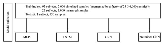 The process of training the ANN was divided into two steps: in the first, the best hyperparameters for the models were determined using simulated inertial sensor data (i.e., synthesised IMU data) from the participants who had 3D motion capture data but did not have recorded (ground-truth) inertial sensor data. The dataset was split into a training and validation set while the ground truth IMU data was used as the test set. To determine the best hyperparameters for the multilayer perceptron (MLP), the long short-term memory (LSTM) and the final two dense layers of the convolutional neural network (CNN) an automated hyperband search [,] was executed (Figure 1).
