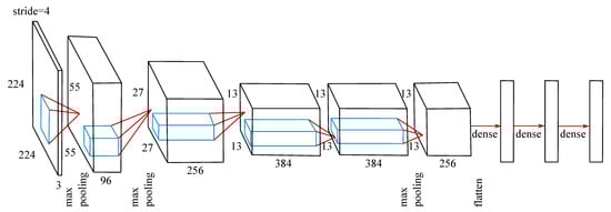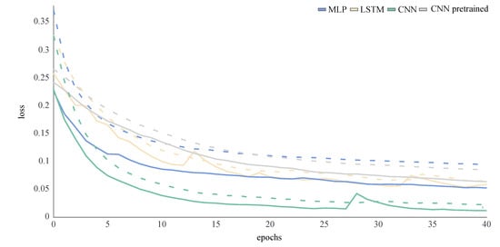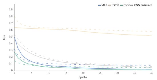 The MLP and LSTM were trained from scratch. The CNN was trained from scratch and transfer learning was applied. For this purpose, the weights of the convolutional layers of a publicly available pretrained caffenet mode [https://github.com/BVLC/caffe/tree/master/models/bvlc_reference_caffenet, accessed on 1 October 2020] were applied (Figure 3).