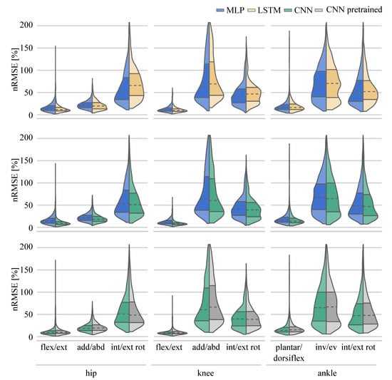 To compare the performance of the different ANNs on the same task, the distribution of the nRMSE is displayed in joint kinematic (Figure 6) and joint kinetic (Figure 7) violin plots. While the distribution of the nRMSE was similar for the kinetics prediction, differences between the LSTM and MLP model violin shapes were observed for the kinematic prediction. This was to be expected given the higher final loss value reported for the LSTM.