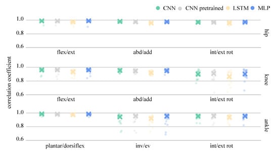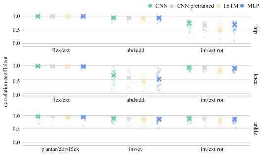 This paper aimed to provide insight into the performance of different ANNs when applied to the task of predicting joint angles and joint moments based on acceleration and angular rate signals of the lower limbs. The dataset used was augmented by simulated inertial data based on gold-standard optical motion capture 3D data. The adoption of this approach meant that the simulated data enhanced the generalisability of the training set to suitably accommodate all of the measured IMU data. This resulted in a training dataset of close to 50,000 samples of more than 100 participants. The prediction was evaluated using directly recorded inertial sensor data–acceleration and angular rate–using a LOSO cross-validation. In previous studies it has been shown that predictions from models trained and tested using simulated data overestimate prediction accuracy [], but simulated data can be used to support predictions based on measured data [].