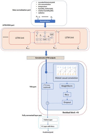 A temporal sequence of data containing both historical yield and environmental information is exploited to predict the future crop yield after a certain period. As shown in Figure 1, a temporal sequence with the length N denoted as … is taken as the network input. The in the temporal sequence is a vector containing the following factors recorded at the time instance t: recorded yield information (g/m), CO concentration (ppm) in the greenhouse, greenhouse temperature (C), humidity deficit (g/kg), relative humidity (percentage) and radiation (W/m).