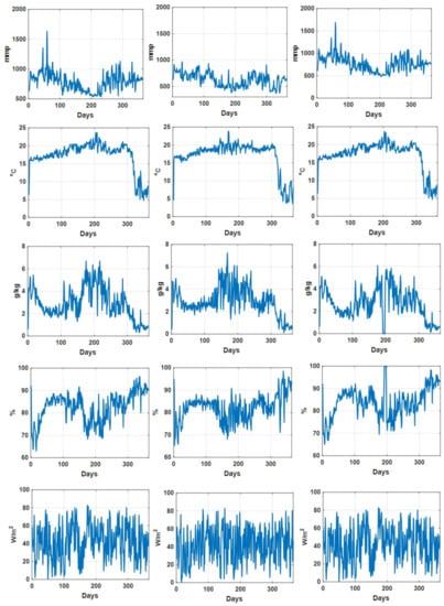 Daily recorded CO concentration (mmp), temperature (C), humidity deficit (g/kg), relative humidity (percentage) and radiation (W/m) associated with dataset 1 (left column), dataset 2 (middle column) and dataset 3 (right column).