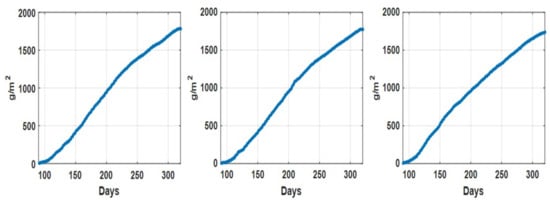 As an illustration, the daily recorded environmental parameters (CO concentration, temperature, humidity deficit, relative humidity, and radiation) for all three datasets are shown in Figure 2. In addition, the descriptive statistical analysis on environmental parameters for different datasets is summarized in Table 2. We can see that for Dataset 2, the descriptive statistics (min, max median, and mean values) of recorded CO concentration values are comparatively lower than those in the other two datasets, while the descriptive statistics of the other environmental parameters for these three datasets are quite consistent. Figure 3 shows the recorded accumulated tomato yield information during a one year period associated with three datasets. Furthermore, we can see that the recorded accumulated dry fruit weights follow similar patterns (due to the fact that they are from one grower at one particular site).