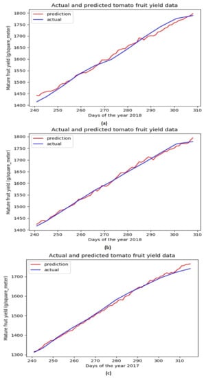 With respect to future work, to further validate the general effectiveness of the proposed model, we will evaluate it on more datasets collected from different growers on different sites. Moreover, we will also test the model’s performance on yield prediction for different types of popular greenhouse crops. More advanced network architecture will also be considered, for example, the LSTM encoder–decoder component as in [] will be considered to be incorporated into the current model to build up a more advanced network architecture. Finally, we will also investigate the combination of the developed machine learning-based model with a biophysical model to achieve more accurate/robust crop yield prediction based on a multi-model framework.