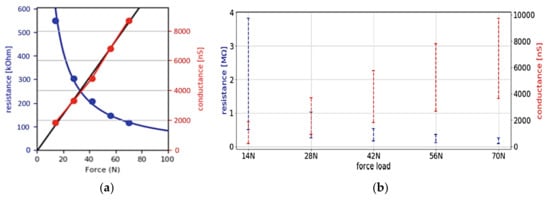 The sensor resistance is given by the sum of the volume resistance of the piezoresistive material (, with the bulk resistivity, the length and the cross-section) and the contact resistances between the Velostat layer and copper electrodes depending on the applied force (, with the bulk resistivity, F the applied normal force, and K parameter depending on elastic properties and roughness of the sample [57]). As the applied force increases, the bulk resistance and contact resistances decrease due to the reduced piezoresistive layer thickness and the increased contact area at a microscopic level between copper electrodes and Velostat layer. Comparing the obtained characteristics, it is evident that sensors 1 and 2, having the larger active area (3 × 3 cm2), are featured by a lower resistance value for a given applied pressure (blue and orange curves in Figure 28b), due to lower values of the Velostat layer’s bulk resistance and contact resistances [58]. Similarly, sensors 3 and 4, having a smaller area (1 × 1 cm2) than sensors 1, 2 and 5, 6 (9 and 3 times, respectively), present higher bulk resistance and contact resistance values for a given applied pressure.
