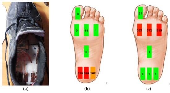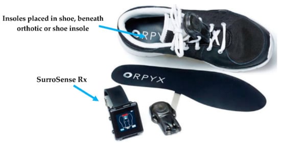 Footwear plays an essential role in foot health, especially for patients with diabetes, to prevent and treat diabetic foot ulceration. In [39], the authors reported on a health device to assess plantar pressures and provide feedback based on set pressure thresholds. The developed insole, called “SurroSense Rx”, stimulated plantar pressure during daily activities (Figure 6). Each insole was equipped with eight pressure sensors located in the highest risk regions of plantar ulcers and 6-DOF (degree of freedom) force/torque sensors; clinical results showed a reduction of ulcer recurrence rate by more than 50%.