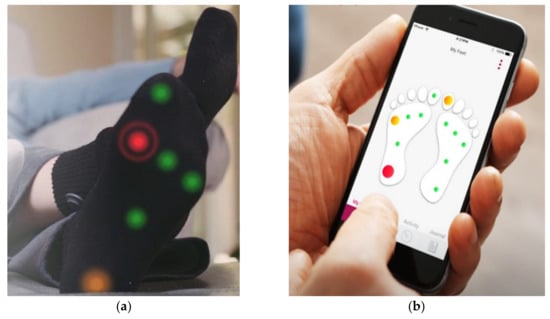 D. Aggarwal et al. proposed novel smart socks allowing physiotherapists to remotely follow patients status [40]; the socks included three pressure and movement sensors for collecting data on weight distribution, movement freedom, and feet orientation, to be shared in real-time, via a web platform, with the physiotherapist. The results indicated that the smart socks were very helpful to understand better the patient’s body conditions and decide the most suitable therapy. Similarly, the Siren startup presented novel smart socks offering constant measurements of gait parameters [41]. The proposed socks monitor the feet health of diabetics, thanks to temperature sensors intertwined with the sock fabric, to detect temperature increase due to inflammation (Figure 7a). The information is transmitted to the smartphone app, which immediately alerts the user with a notification or SMS (Figure 7b). In addition, the socks can integrate various sensors, such as humidity, pressure, light and movement sensors, LEDs, and RFID chips.