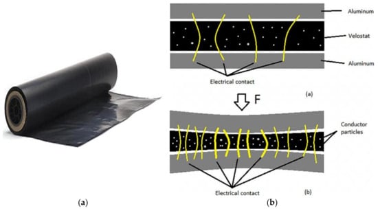 The Velostat piezoresistive material, also known as Linqstat, was developed by Custom Materials, now part of the 3M company and was later purchased by “Desco Industries” in 2015, becoming a US brand (Figure 10a) [13].