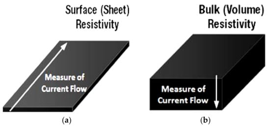 - Surface resistivity () (Figure 11a), which measures the electrical conduction of materials with thickness H much less than width W and length L; instead, is the resistance and the corresponding bulk resistivity of the sample. This quantity is given by: