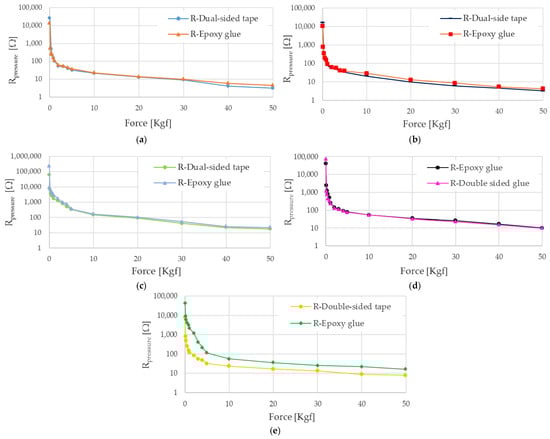 At first, we tested five different piezoresistive sensors, named sensor i (i = 1,2,…5), with different sizes. The sensors have been applied to a felt slab using, at first, the dual-side tape, and then, the epoxy glue to determine the effect of the fixing method on the resistance vs. force sensor characteristics. All sensors were subjected to an ascending force from 0 to 50 kgf and following the procedure previously described.