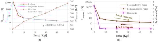 Moreover, another 3 cm × 1 cm piezoresistive sensor, called sensor 6, has been tested to determine the R vs. F response for different support materials: a rigid base, a sponge slab, and a felt insole. At first, the sensor was placed on the press’s rigid support and changing the applied force between 0 Kgf and 50 Kgf, considering 8 min recovery time between consecutive measurements. These data have been obtained as the average value of the measurements carried out on four different measurement campaigns. The results of this characterization are shown in Figure 18a (red curve), along with the characteristic related to the sensor resistance’s reciprocal as the applied load varies. This observation confirms the previous hypothesis related to the hyperbolic trend of the . Indeed, the resistance reciprocal (blue curve, Figure 18a) of the sensor is close to a linear trend, featured by an average error of 565 × 10−6 Ω−1 and a mean square error of 4.26 × 10−5 Ω−1 from the linear regression (green curve, Figure 18a). Afterwards, sensor 6 has been subjected to loading/unloading cycles from 0 Kgf to 50 Kgf, leaving a rest–pause between consecutive loads of 8 min before to measure the resistance. In Figure 18b are reported the characteristic for ascending (curve orange) and descending load (grey curve); as evident, the sensor shows a hysteresis in the two responses, already observed in previous characterizations [52]. The hysteresis is the maximum difference between the sensor’s responses for a single load once applied in ascending and descending way. The hysteresis error is expressed by the following relation: