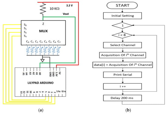 Schematic representation of the acquisition section of the signals related to the piezoresistive sensors of the developed piezoresistive matrix (a); flowchart of the Arduino board’s firmware for acquiring the resistance from the eight piezoresistive sensors (b).