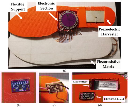Prototypes of smart insole proposed in [45], Copyright 2018 Elsevier; first prototype (a) block diagram of the first device version (b); prototype of the smart insole (c), and the second version of the insole with the energy harvesting system (d).