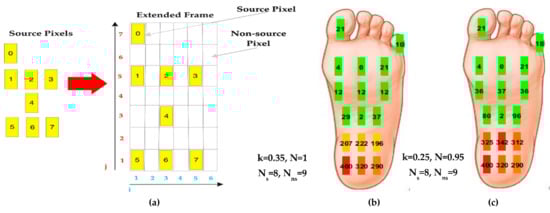 Subsequently, the plantar pressure map was extended using an interpolation method proposed in [28]. This last evaluates the pressure value in an unknown position, called a non-source pixel, as a weighted linear combination of pressure values in known positions, called source pixels. Specifically, the pressure value in an (i,j)-th non-source pixel (, Figure 27a) is obtained by summing the s-th source pixel pressure values () weighted for terms inversely proportional to the distance between them (.