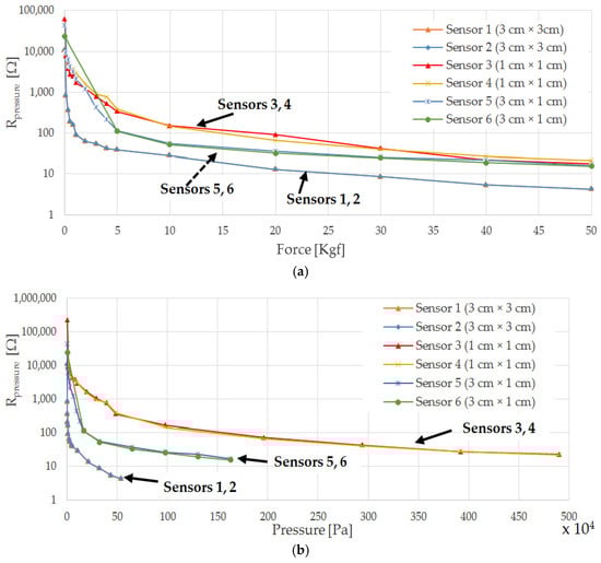 Summarizing graphs of characteristics ( as a function of applied force (in Kgf) (a) and pressure (in Pa) (b) for previously tested sensors, all applied by epoxy glue on a felt base.
