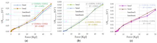 Trends of the reciprocal of sensor resistance as a function of the applied force (expressed in Kgf) for sensors 1 and 2 (3 cm × 3 cm) (a), sensor 3 and 4 (1 cm × 1 cm) (b), and sensor 5 and 6 (3 cm × 1 cm) (c).