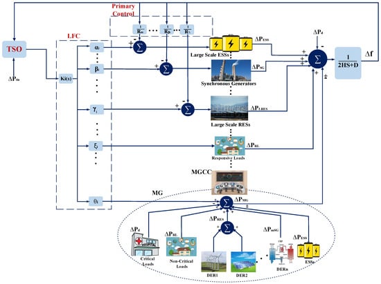 Frequency control in the power system with the MG presence. The power system includes RES and SG-based power plants, Large scale ESSs, RLs, and MGs. Each element supports FR with the portion that is specified by TSO. The MG also includes RES and SG-based power plants, ESSs, critical, and noncritical loads that contribute to the FR in the MG domain. The MG elements are under the supervisory of MGCC.