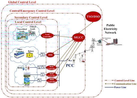 Four different levels of control in the MG. The MG under the central control unit called MGCC interconnects the utility grid.