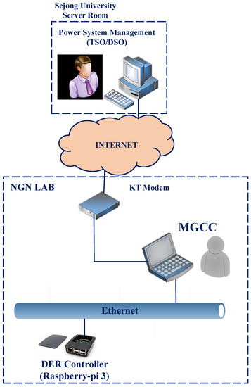 MG as FR-support network infrastructure (Experimental setup). The MG is arranged in the NGN Lab’s LAN, where DER controllers and MGCC are located. The WAN for interaction between MGCC and TSO/DSO is implemented through the Internet connection between NGN Lab and the Sejong University server room.