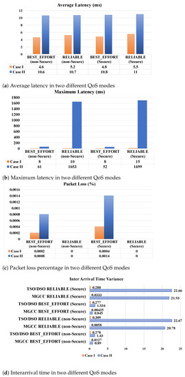 Figure 5 depicts the average and maximum latency, interarrival time variance, and message loss rate of test results. Overall, this figure shows that in RELIABLE and secure communication, there is the cost of rising latency. As expected, in Case I, pure DDS system, latency is less than Case where the MGCC needs to negotiate with its elements on the MMS protocol. Looking at the detail, Figure 5a shows in the BEST_EFFORT mode, the average latencies of Case I are 4.6 and 4.8 ms for nonsecure and secure mode, respectively, which increased to 5.2 and 5.5 ms in RELIABLE mode. This increment in latency is due to the retransmission in any case of packet loss in RELIABLE mode from. Average latency in Case doubled to 10.6 and 10.7 ms in nonsecure mode for BEST_EFFORT and RELIABLE modes respectively and these values change to 10.8 and 11 ms for secure mode. However, Figure 5c clarifies the importance of setting the RELIABLE mode of QoS for DDS as it has the effect of eliminating packet loss of the system.