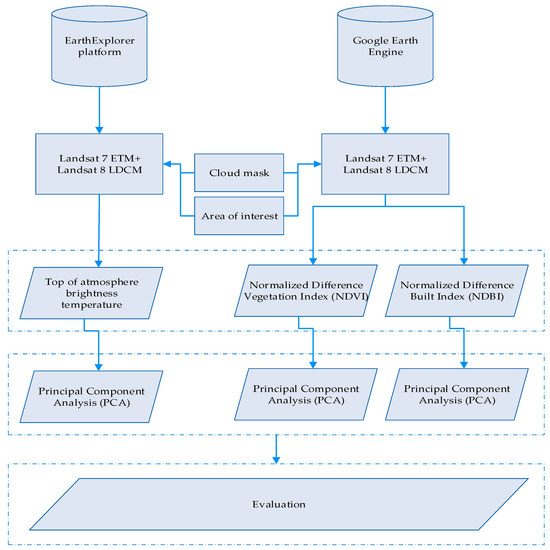 The overall methodology of this study is grouped in two parts as follows (Figure 1): the first one is related to desktop image analysis processing, while the second includes the use of big data cloud platforms. For the first part, land surface temperature (LST) estimations were extracted from Landsat archival images, while during the second, optical satellite data were processed on cloud platforms to produce various products such as the normalised difference vegetation index (NDVI) and the normalised build area index (NDBI).